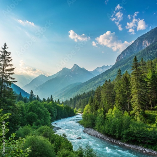 Obraz premium Beautiful mountain landscape with river and green forest