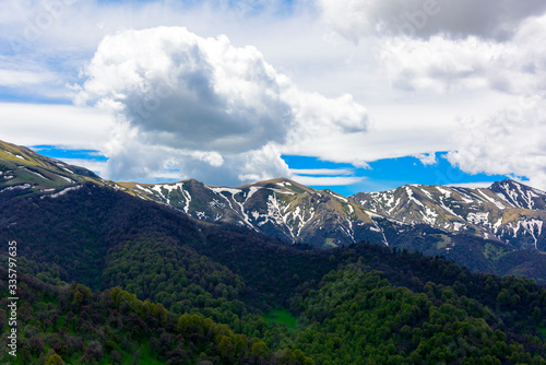 Obraz premium Beautiful mountain panorama with lush greens, blue skies, and puffy clouds