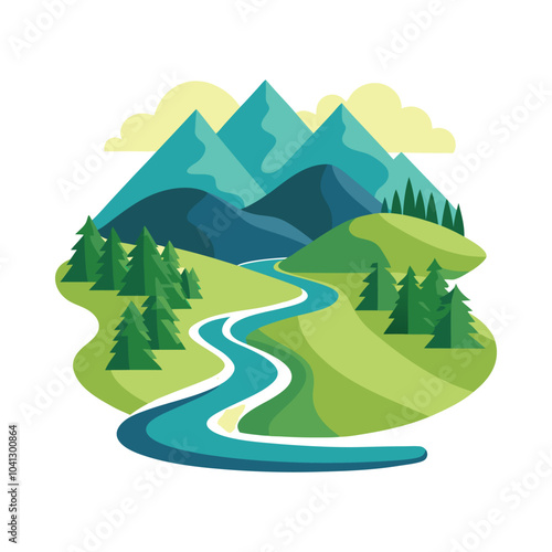 Obraz premium Beautiful mountain river vector illustration featuring lush green hills, tall...