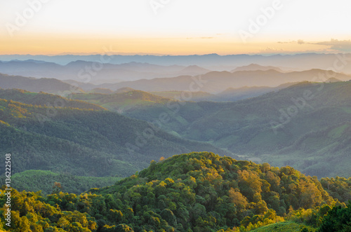 © Udomsak, Fototapeta premium Beautiful mountain view, layer of mountain with sunset, view point at Khun Yuam Mae hong son Thialand