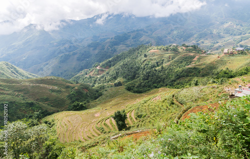 Fototapeta premium beautiful mountain with rice terraces and fog in morning