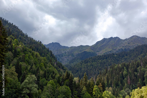 Obraz premium Beautiful mountains covered with spruce against the cloud sky, used as a...