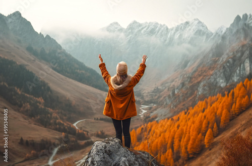 © jeff, Obraz premium Beautiful mountains in fog and a standing young woman with arms raised