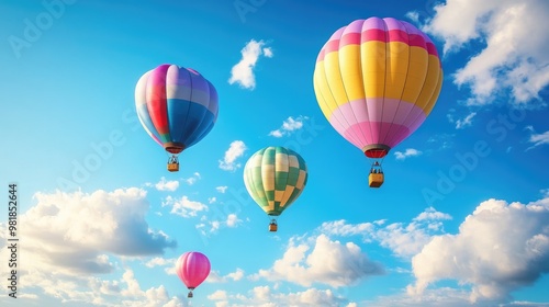 Fototapeta premium Beautiful multicolored balloons soaring high in the sky, with a stunning blue backdrop and light clouds, creating a joyful, realistic scene