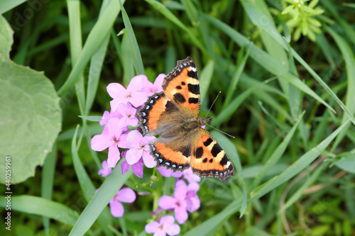 Obraz premium Beautiful multicolored butterfly close-up on purple wildflowers on a blurry...