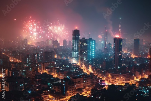 © Tanu, Fototapeta premium Beautiful Mumbai's skyline illuminated by spectacular fireworks. Ai generated