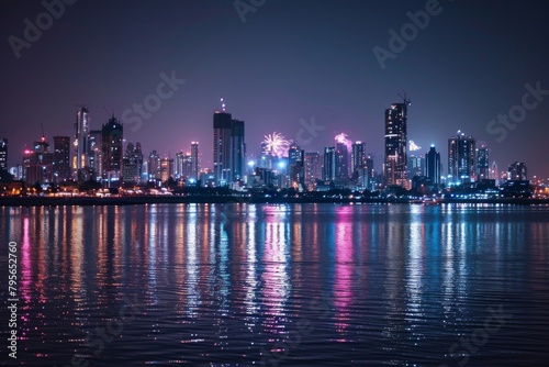 © Tanu, Fototapeta premium Beautiful Mumbai's skyline illuminated by spectacular fireworks. Ai generated