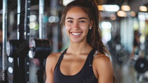 Fototapeta premium Beautiful muscular young woman smiling. Girl trainer instructor in the gym