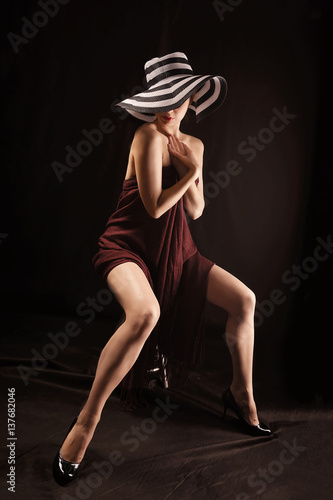 Fototapeta premium Beautiful naked woman covering body with brown cloth , a photo full length in...