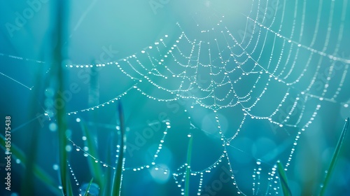 © The Little Hut, Naklejka premium Beautiful natural background with necklace of water droplets on a cobweb in grass in spring of summer in blue tones Texture Dew drops on a spider web in nature closeup macro with soft : Generative AI