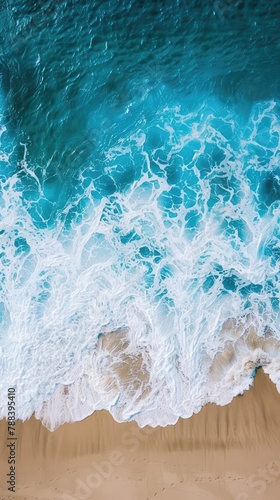 © DailyStock, Naklejka premium Beautiful natural summer vacation background. Aerial top view drone shot of turquoise waves breaking white bubbles on pristine white sand