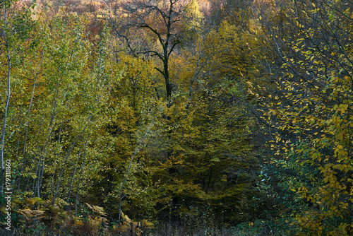 Obraz premium Beautiful nature autumn forest with yellow and green trees