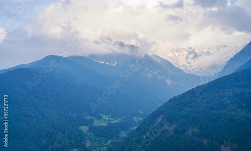 Obraz premium Beautiful nature background. Wonderful springtime landscape in mountains. Forested mountain slopes in low lying cloud with the evergreen conifers in a scenic landscape view.
