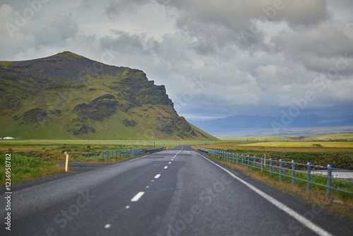 © Ekaterina Pokrovsky, Fototapeta premium Beautiful nature landscape with green fields and majestic cliffs with ice and snow in Southern Iceland.