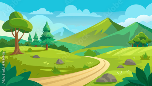 Obraz premium Beautiful nature landscape with green grass, hill, trees, and footpath vector illustration