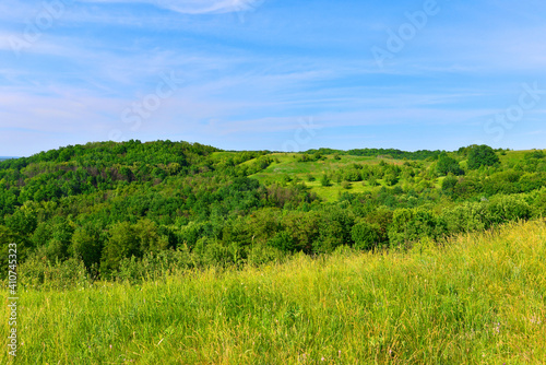 Fototapeta premium Beautiful nature. Summer landscape with steppe, trees, blooming wild grass...
