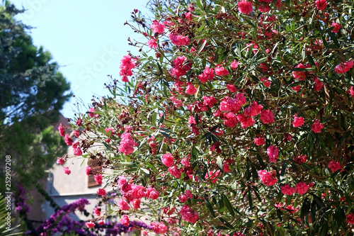 Fototapeta premium Beautiful nerium flowers in Mediterranean park. Selective focus.