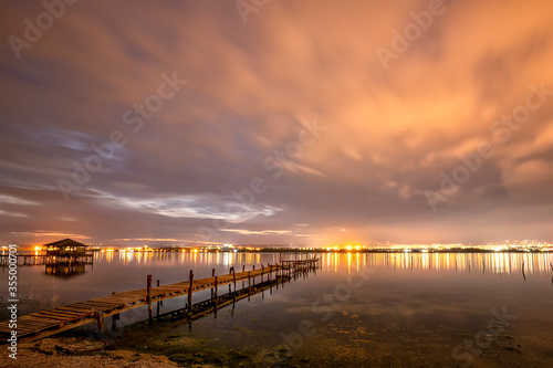 © EdVal, Fototapeta premium Beautiful night reflections in the sea from the port and moving clouds