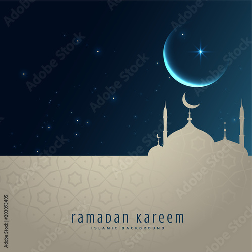 Naklejka premium beautiful night scene with mosque and moon, ramadan kareem greeting