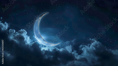 Fototapeta premium Beautiful night sky with crescent moon and clouds. Night background. Blue illumination light