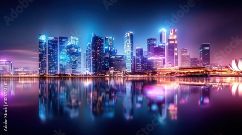 Fototapeta premium Beautiful night skyline with illuminated buildings and reflections on a river, capturing the energy of the city.