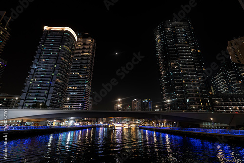 © diy13, Naklejka premium beautiful night view of dubai marina skyscrapers from the water side on the river. Bridge in Dubai Marina illuminated at night