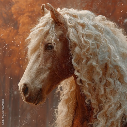 © Georgii, Obraz premium Beautiful noble brown horse with long curly white mane in autumn backdrop