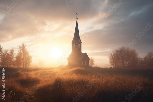 © twindesigner, Obraz premium Beautiful Nordic church nestled in a serene and picturesque landscape at sunrise, with misty hills and mountains in the background, surrounded by trees, and with a river flowing nearby. Ai generated