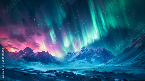 Fototapeta premium Beautiful northern lights in the night sky. Aurora borealis background with...