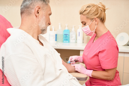 Obraz premium Beautiful nurse taking blood sample from man in doctor's office