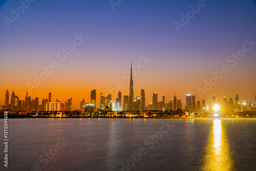 Naklejka premium Beautiful of Dubai Skyline view from the Dubai Creek. Panoramic view of Dubai city skyline. Cityscape in Dubai. UAE.
