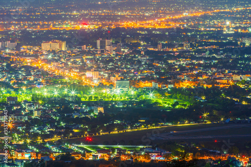 © Thinapob, Obraz premium Beautiful of Landscape View cityscape over The color of the lights and city center of Chiang mai,Thailand at twilight night background.