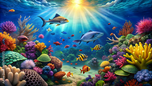 Naklejka premium Beautiful of the ocean with vibrant colors and detailed marine life, ocean,...