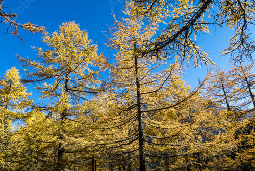 © Anukool, Fototapeta premium Beautiful of Yellow pine forest in autumn with blue sky in the background at Yading Nature Reserve, Sichuan, China