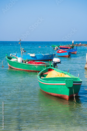 © Michele Ursi, Naklejka premium Beautiful old colored fishing wooden boats on the water, vertical