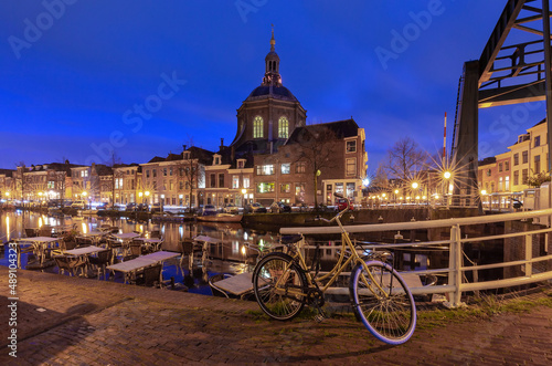 Fototapeta premium Beautiful old houses on the city embankment of Leiden at sunset.