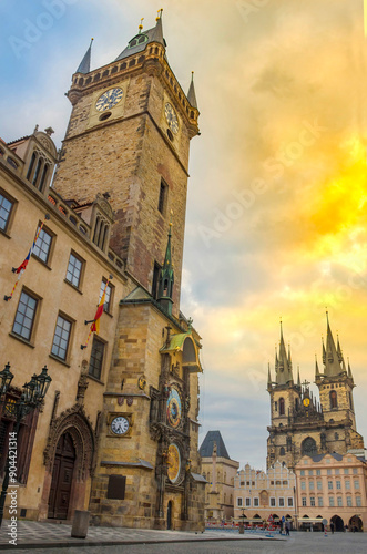 Naklejka premium Beautiful Old Town Square with Church of our Lady Tyn and medieval astronomical clock on the Old Town Hall Tower, in Prague, Czech Republic, at sunrise