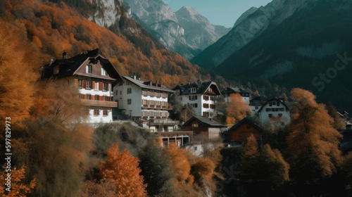 © Natee Meepian, Fototapeta premium Beautiful old town surrounded by mountains view. Generative AI
