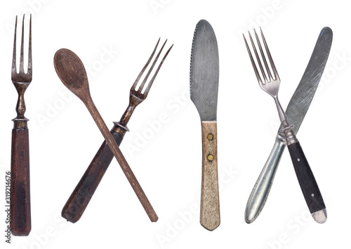 © Karjalas, Fototapeta premium Beautiful old vintage fork and knife isolated on white background. Top view. Retro silverware