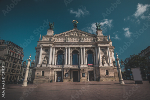 © Anze, Fototapeta premium Beautiful opera building in Lviv, Ukraine on a hot summer day. Some clouds seen on blue skies.
