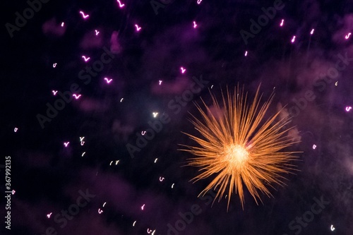 © azur13, Fototapeta premium Beautiful orange big bang science object with glowing core. Scientific artificial scene in microcosm or macrocosm show e.g. dangerous virus or explosion birth of star in cosmos. Dark background