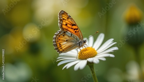 © CooLKenG, Obraz premium Beautiful Orange Butterfly on White Daisy Flower in Summer Garden