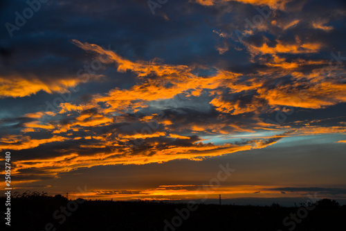 © Dan, Fototapeta premium Beautiful orange clouds reflecting sunset colors above dark landscape