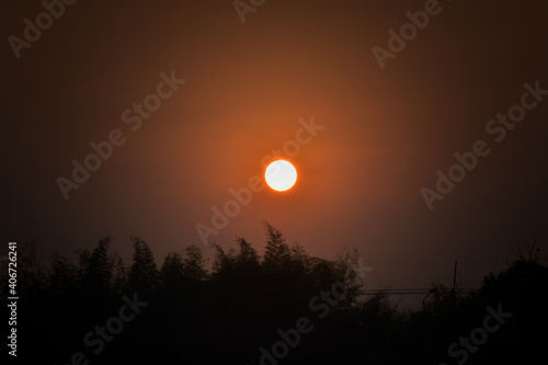 Obraz premium Beautiful orange color of sky from sunrise over tree bush in morning fresh....