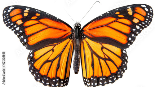 © Pangsiri, Fototapeta premium Beautiful orange monarch butterfly with black and white wings, isolated on a white background