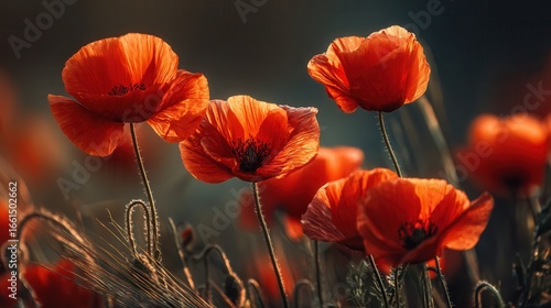 © Solo, Obraz premium Beautiful orange poppy flowers blooming in a serene field during sunset in early spring