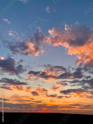 © Олена Венгер, Fototapeta premium Beautiful orange sunset. The sun's rays look through the clouds. Evening hour.