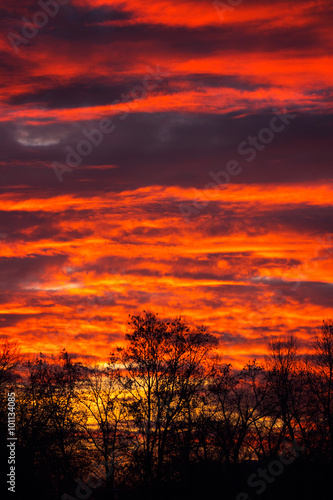 © Marina P., Fototapeta premium Beautiful orange sunset with dark clouds and trees silhouettes