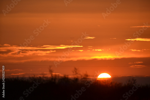 © Dan, Naklejka premium Beautiful orange sunset with sun on horizon of dark landscape