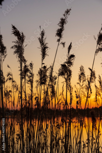 Fototapeta premium beautiful orange-yellow sunset on a lake with tall grass